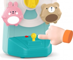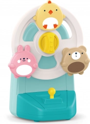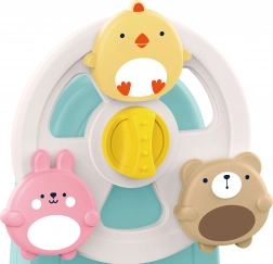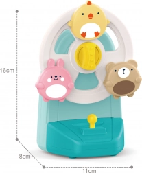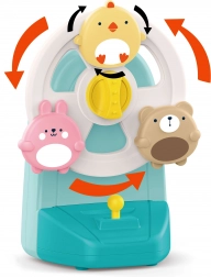 L’enfant actionne facilement le mécanisme rotatif à l’aide du bouton jaune, observe le mouvement des animaux et entraîne sa motricité fine ainsi que la coordination œil–main.