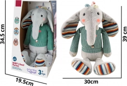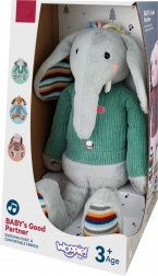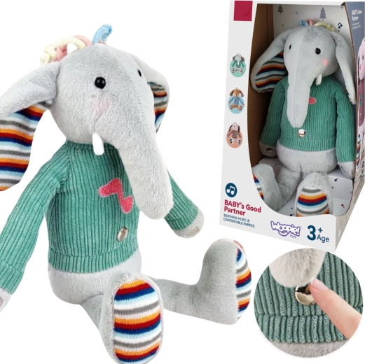 L’éléphant en peluche interactif Woopie est équipé de trois zones sensorielles sur les pieds et le ventre qui, au toucher, jouent de la musique. Ses joues rosées s’illuminent, créant une ambiance magique autour du jouet. La peluche porte un pull sous lequel se trouve l’emplacement pour 3 piles. Ce doux éléphant tactile deviendra l’ami de l’enfant pour de nombreuses années.