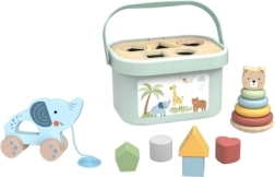 1× boîte avec couvercle–trieur, 5× blocs de formes, 1× pyramide (4 anneaux + tête d’ourson), 1× éléphant à tirer
