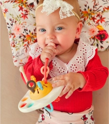 Ce jouet Montessori pour bébé WOOPIE BABY en forme d’UFO offre de riches stimulations sensorielles grâce à six cordelettes aux textures et couleurs différentes, trois boutons souples et un bouton coulissant plus ferme. Tirer sur les cordelettes génère différents sons et de légères vibrations, stimulant la curiosité et la concentration. Des bords doux et des surfaces texturées apportent un soulagement aux gencives sensibles pendant la dentition.