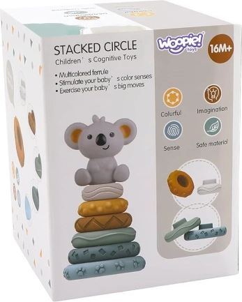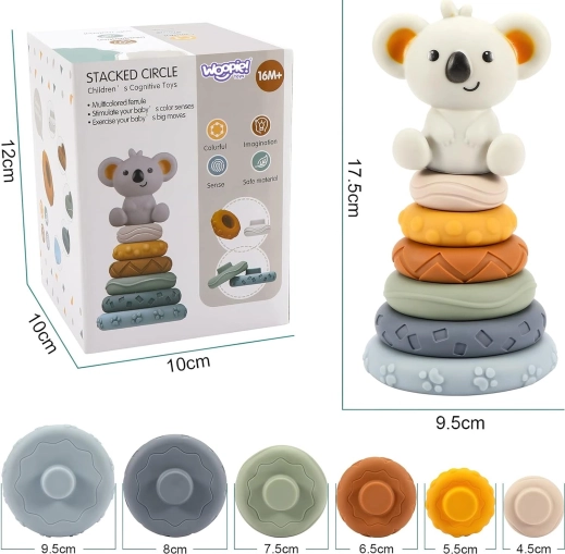 Adorable pyramide à empiler de la marque WOOPIE, un jouet éducatif et sécurisé pour les tout-petits. Fabriquée en matériau souple, flexible et non toxique, elle sert aussi d’anneau de dentition. Six anneaux de tailles différentes et une figurine de koala au sommet stimulent la perception sensorielle, la coordination œil-main et la motricité fine.