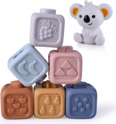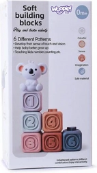 Les cubes sensoriels en silicone WOOPIE, doux et aux couleurs pastel, favorisent le développement précoce de l’enfant dès la naissance. Les six cubes avec chiffres en relief stimulent le toucher, la vue et la logique, et le matériau sûr sert aussi d’anneau de dentition pour les poussées dentaires. Les cubes peuvent être empilés, pressés (ils pouêtent), assemblés grâce aux reliefs, et s’utilisent aussi lors des jeux d’eau. Le koala tout mignon apporte un charme ludique à l’ensemble.