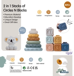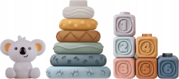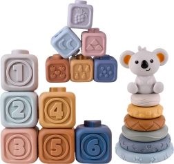 Ce jouet éducatif multifonction 3-en-1 de la marque WOOPIE comprend six anneaux à empiler surmontés d’une adorable figurine de koala et six cubes en silicone souple avec chiffres et images en relief. Grâce à sa texture agréable et souple, il tient parfaitement dans la main de l’enfant et sert aussi de hochet de dentition sûr. L’ensemble est idéal pour jouer au quotidien à la maison et dans le bain.