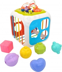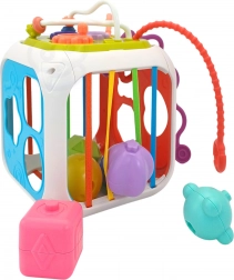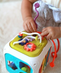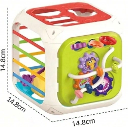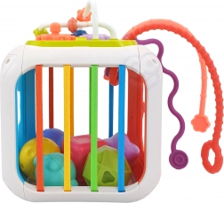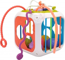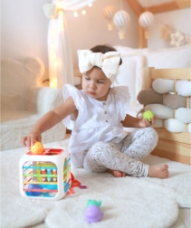 La cube est fabriquée en plastique ABS et silicone de haute qualité, durable et sûre pour les petites mains. Elle comprend également des blocs de tri avec grelots cachés, qui encouragent l’expérimentation des sons, des formes et des couleurs. La partie supérieure amovible élargit les possibilités de jeu – l’enfant peut l’utiliser séparément sur un tapis ou dans la poussette.