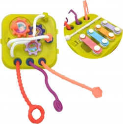 Le panneau amovible avec mini xylophone éveille l’amour de la musique et développe le sens du rythme ainsi que l’audition. L’enfant entraîne la précision de la prise et la coordination en frappant les lames.