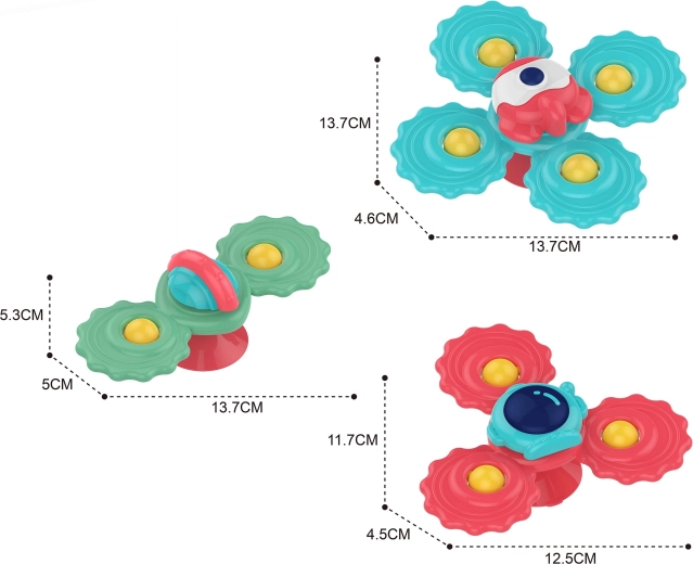 Ensemble interactif de 3 spinners colorés de WOOPIE offrant aux enfants divertissement et développement sensoriel. Chaque spinner possède 2, 3 ou 4 bras, se fixe facilement sur les surfaces lisses grâce à une ventouse et est fabriqué à partir de matériaux sûrs pouvant servir de hochet de dentition. Parfait pour stimuler la motricité fine, la vision et la concentration.