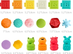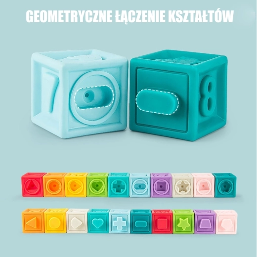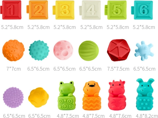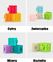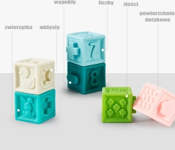 Découvrez les cubes sensoriels WOOPIE BABY ludiques et éducatifs, qui couinent lorsqu’on les presse et développent les sens de l’enfant grâce à différentes textures, couleurs et reliefs. L’ensemble de 20 pièces avec des chiffres, des symboles mathématiques, des animaux, des formes géométriques et des fruits favorise la coordination, la motricité fine et l’apprentissage du calcul. Les cubes sont souples, agréables au toucher, emboîtables et peuvent servir de jouet de dentition pour les enfants dès 6 mois.