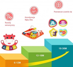 Le cube sensoriel interactif WOOPIE offre à la fois un divertissement varié et un apprentissage. L’enfant découvre différentes textures, formes et sons, apprend à reconnaître les couleurs et s’exerce à saisir, presser et tourner. Le panneau musical avec les touches DO, RÉ, MI, FA propose cinq modes, des effets lumineux et des dizaines de mélodies qui stimulent le développement de l’ouïe et du sens du rythme.