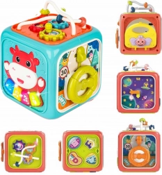 Outre les fonctions musicales, le cube comprend une boîte à formes avec 4 pièces et lettres, une horloge rotative, des engrenages, un volant avec petite voiture et un labyrinthe à billes. Le plastique robuste, les bords arrondis et les peintures non toxiques garantissent un jeu sécurisé dès les premiers mois. Alimentation par 3× AA (non incluses).