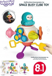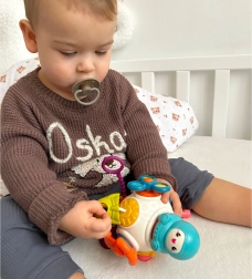 - 8 en 1 (astronaute rotatif, mécanisme à enrouler/anneau de dentition, toupie, retour à ressort, volant avec sons, clé à insérer, bateau coulissant, bouton sonore)