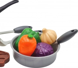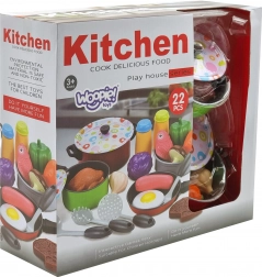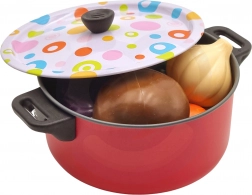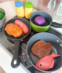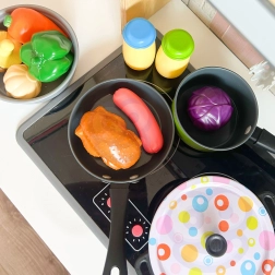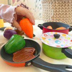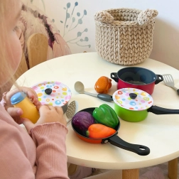 Des casseroles avec couvercles, une poêle et des ingrédients colorés permettent aux enfants d’imiter la vraie cuisine et de développer imagination et motricité fine.