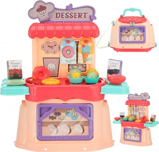Ce set coloré ouvre aux enfants l’univers des douceurs – des donuts et cupcakes aux glaces – tout en offrant une conception pratique qui se transforme en un instant d’une valisette compacte en véritable petit comptoir. Grâce à la bandoulière, les enfants le transportent aisément et peuvent ouvrir leur mini pâtisserie où qu’ils soient.