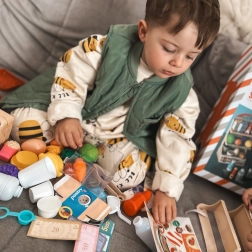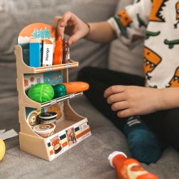 Le jeu de magasin encourage la pensée autonome, la communication et le jeu créatif. Grâce aux 42 éléments – des fruits et légumes aux boissons et conserves – les enfants créent leurs propres scénarios et s’exercent à des situations du quotidien.
