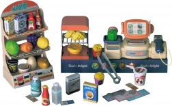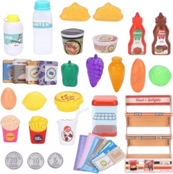 Le set comprend des fruits, des légumes, des boissons, des conserves, des billets et des pièces – tout pour de longues heures de jeu créatif en magasin.