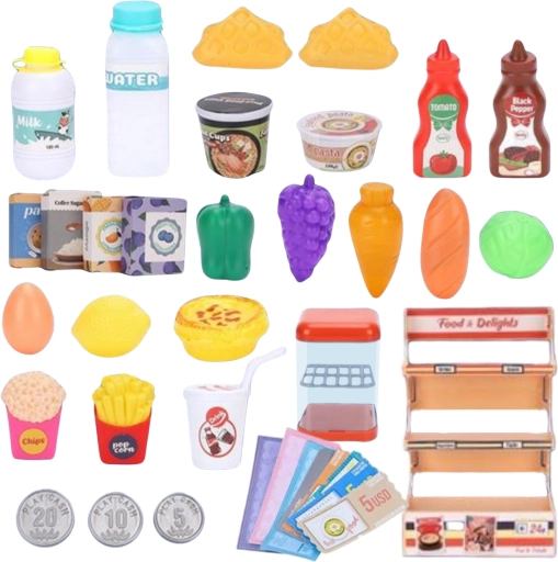 - Équipement riche (42 pièces) : billets en papier, pièces, fruits, légumes, boissons et plus encore.