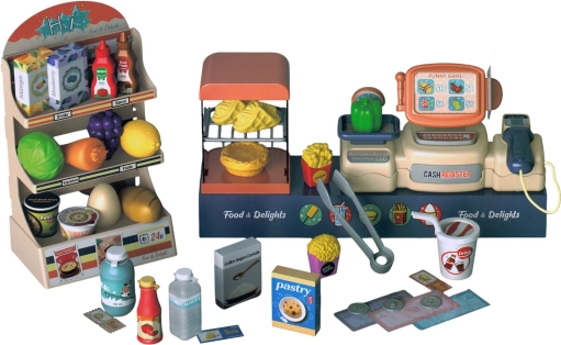 - supermarché avec étagère, caisse, scanner de codes-barres, balance, billets en papier, pièces, divers aliments (fruits, légumes, boissons, etc.), pince de service