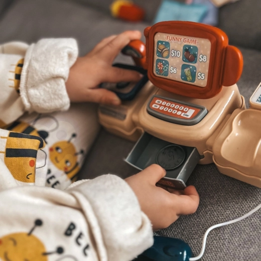 Les enfants peuvent “biper” les produits et entendre des sons de scan authentiques. Le tiroir-caisse et les boutons favorisent un jeu réaliste et l’apprentissage du paiement.