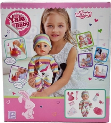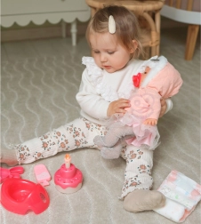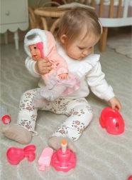 - poupée, robe, couche, biberon, gâteau d’anniversaire avec son, bol, tétine, petits accessoires