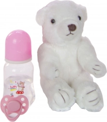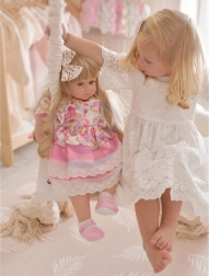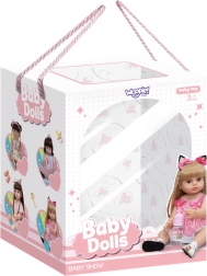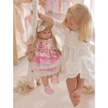 La poupée porte une robe rose avec de jolis volants et des chaussures roses assorties avec un bandeau correspondant, ce qui lui donne une allure charmante. Ses fonctionnalités interactives comprennent diverses réactions aux stimuli, y compris des rires, des pleurs et des gargouillements de satisfaction lors des câlins. La poupée est également équipée d'un système sonore qui nécessite trois piles de type AA (non incluses).