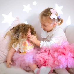 De fins cils, des yeux expressifs et de longs cheveux à coiffer stimulent la créativité. Un ventre pelucheux et des membres en silicone souple confèrent à la poupée un toucher naturel.