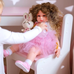 La poupée RAQUEL de la collection ROYAL séduit par son réalisme – des cils délicats, de beaux yeux et de longs cheveux brillants qui invitent à créer des coiffures. Le corps est agréablement souple et pelucheux, la tête et les membres sont en silicone souple pour un toucher naturel. S’assoit seule et, grâce à des vêtements amovibles lavables en machine, l’entretien de la poupée est facile.