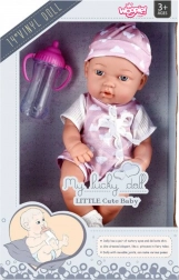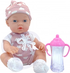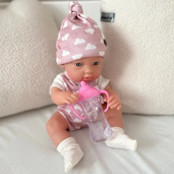 La poupée possède des bras et des jambes souples en caoutchouc et un petit corps en plastique rigide sans rembourrage en peluche, ce qui assure durabilité et entretien facile. L’emballage comprend également un biberon rose que la poupée peut tenir dans ses mains – parfait pour jouer à la nourrir.