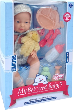 Le set contient tout ce qu’il faut aux petits soigneurs : poupée habillée, tétine, ourson, biberon et kit de repas (assiette, fourchette, cuillère), complétés par deux flacons de “cosmétiques” pour les scènes de bain et de soin. La poupée possède des membres souples en caoutchouc, articulés et un corps en plastique sans rembourrage en peluche.