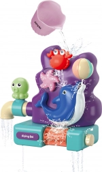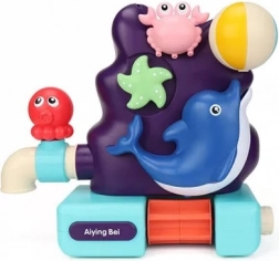 Fixez le panneau aux animaux marins à l’aide de 3 ventouses sur une surface lisse de la baignoire ou du carrelage, et que la fête commence. Après avoir versé de l’eau dans le réservoir supérieur, le flux se met en route en passant par le crabe, fait tourner l’étoile de mer et, près du petit dauphin, active le moulin à eau ainsi que le robinet latéral, créant une petite fontaine.