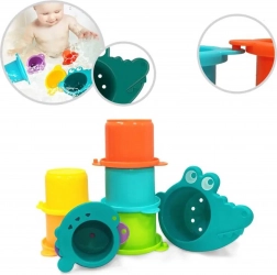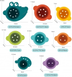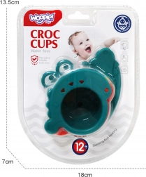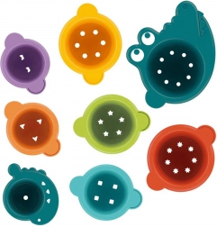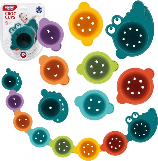 Les gobelets peuvent s’emboîter, s’empiler en une haute tour ou se connecter latéralement pour former une longue « queue ». L’un des gobelets adopte l’adorable look d’un crocodile, ajoutant une dose supplémentaire de fun au bain. Les couleurs et la forme des trous aident à apprendre les couleurs et les formes géométriques.