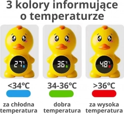 Échelle de couleurs intuitive : bleu = moins de 34 °C, vert = 34–36 °C, rouge = plus de 36 °C. La forme ergonomique du petit canard est adaptée aux enfants et sûre pour une utilisation dans l’eau. Un assistant idéal pour le bain quotidien et les jeux d’eau estivaux.