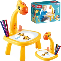 La table de dessin à projecteur en forme de girafe projette des motifs colorés directement sur la surface de la table ou sur une feuille insérée. Les enfants choisissent un motif, allument le projecteur et décalquent simplement les contours – ils apprennent à dessiner pas à pas. La surface est effaçable à sec, vous effacez les dessins avec l’éponge fournie et pouvez créer encore et encore.