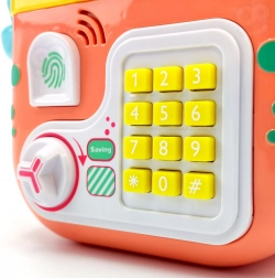 Rangez pièces et billets via des fentes séparées, définissez un mot de passe et ouvrez grâce à la molette rotative. Idéal pour les premiers pas vers l’éducation financière.