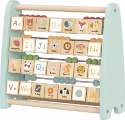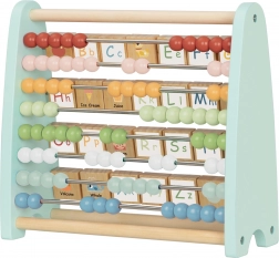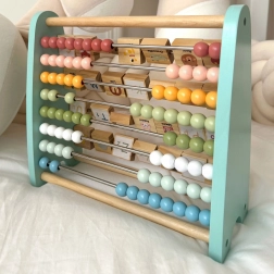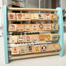 Un côté comporte un boulier classique avec des perles pour le comptage, l'autre côté a des blocs tournants avec des lettres de l'alphabet et des images pour un apprentissage interactif.
