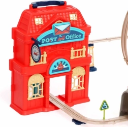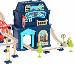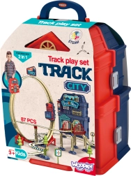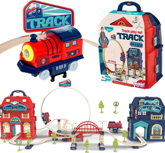 Le circuit WOOPIE Track City offre aux enfants un riche univers d’imagination sur 3,5 mètres de rails. Grâce à la boucle, au viaduc et au passage à niveau, les enfants créent facilement des tracés dynamiques et des scènes de ville. La valise 2‑en‑1 sert d’emballage pratique et d’élément du monde de jeu – une fois dépliée, elle forme deux bâtiments stylés (par ex. un bureau de poste et une librairie) qui enrichissent histoires et jeux.