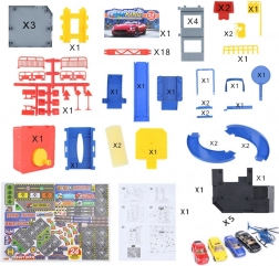 La boîte contient 4 petites voitures métalliques, un hélicoptère, des panneaux de signalisation, des cônes et des autocollants. Il suffit d’assembler et le jeu peut commencer immédiatement.