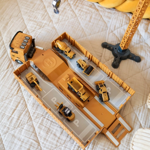 Ce set complet stimule l’imagination, la créativité et développe la coordination œil‑main. Les enfants construisent leur propre chantier, dirigent la circulation grâce aux cônes et panneaux, et déplacent les charges avec la grue exactement là où il faut. Le grand camion sert de base avec une plateforme dépliable, dans laquelle vous rangez facilement tous les véhicules et accessoires.