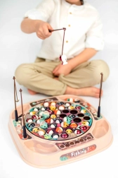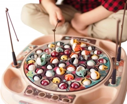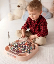 Le jeu d’adresse pêche apprécié, dans une version moderne. Une fois allumé, le plateau avec les poissons tourne lentement au rythme de la musique et certains poissons s’ouvrent – c’est le bon moment pour les attraper avec la canne. Les couleurs vives et la dynamique du jeu captent immédiatement l’attention des enfants et stimulent une saine compétitivité.