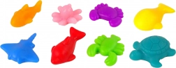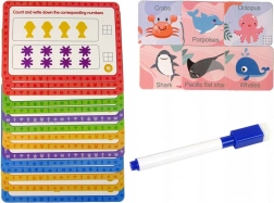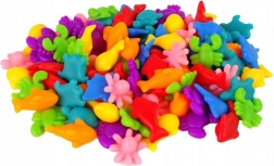 Le set comprend au total 111 pièces, dont 16 cartes de tâches, grâce auxquelles les enfants apprennent à assembler et à compter. Les figurines marines de différentes couleurs (par ex. des dauphins rouges, des poissons jaunes, des crabes violets) offrent la possibilité de stimuler l’imagination et d’accroître l’interaction avec l’enfant. Le tout dans un environnement sûr grâce aux figurines en gomme.