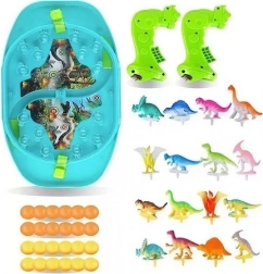 1× plateau de jeu avec couvercle et emplacements pour dinosaures, 2× lanceurs, 24× balles en mousse (jaunes et orange), 16× figurines de dinosaures colorées, emballage cadeau