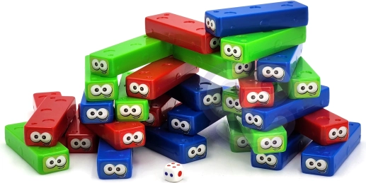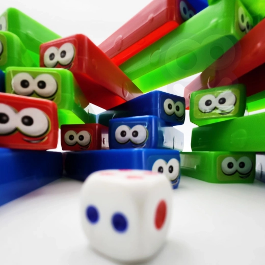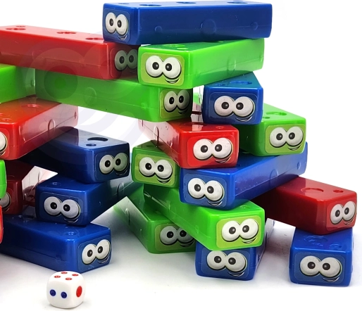 - Blocs colorés avec de petits yeux, dé (selon la variante)