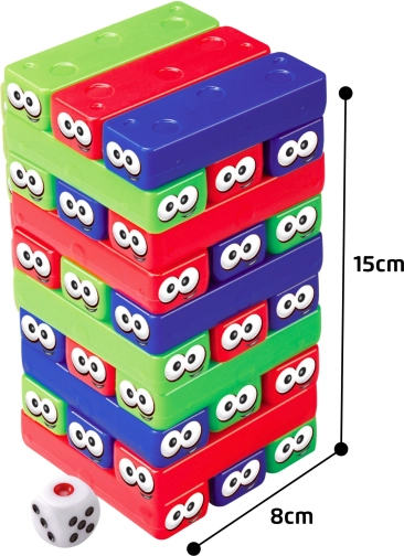 Les couleurs joyeuses et les blocs avec des yeux amusent les enfants. La tour mesure environ 15 cm de haut et 8 cm de large – facile à emporter en voyage.