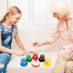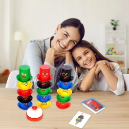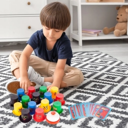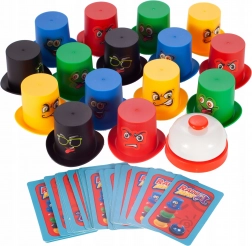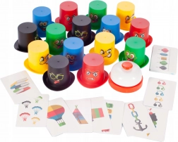 Principe du jeu: Chaque joueur reçoit 5 chapeaux colorés et essaie de les ranger aussi vite que possible selon le modèle sur la carte. Dès que vous terminez la tâche, sonnez rapidement la cloche ! Gagne le joueur avec les meilleurs réflexes et observations.