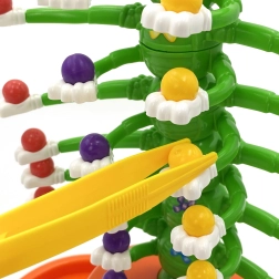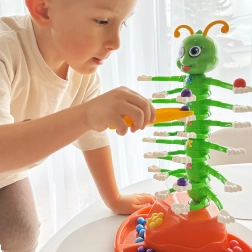 Les enfants utilisent les pincettes pour déposer avec précision les billes sur les pattes mobiles de la chenille, développant ainsi naturellement la coordination œil-main et la patience.