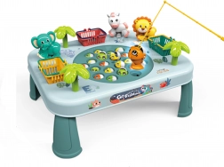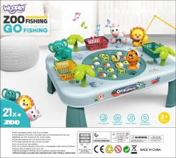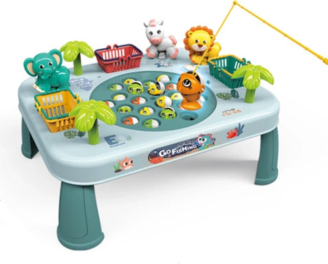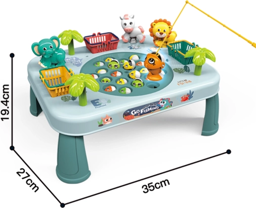 Contenu de l’emballage : 1 table de jeu, 4 pieds, 3 cannes, 3 paniers à poissons, 3 figurines d’animaux, 3 palmiers, 21 petits poissons, autocollants.