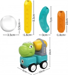 12 boules, 12 bâtons longs et 12 bâtons courts en quatre couleurs, 4 têtes de dinosaure, 8 cadres pour roues, 8 roues doubles, 1 remorque, 1 pelle de pelleteuse, 1 bétonnière, 1 perceuse, et d'autres pièces pour voitures