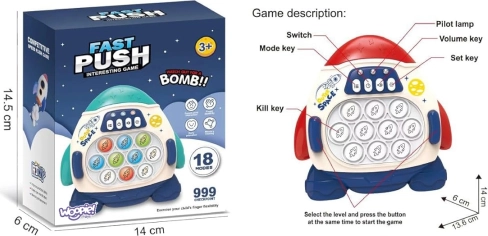 Le jouet amusant WOOPIE Pop It Fusée combine un outil antistress avec un jeu électronique d’adresse et éducatif. Il offre des effets lumineux et des sons joyeux, jusqu’à 999 niveaux et 4 modes de jeu pour entraîner la mémoire, les réflexes et la concentration. Ses dimensions compactes en font un compagnon de voyage idéal.