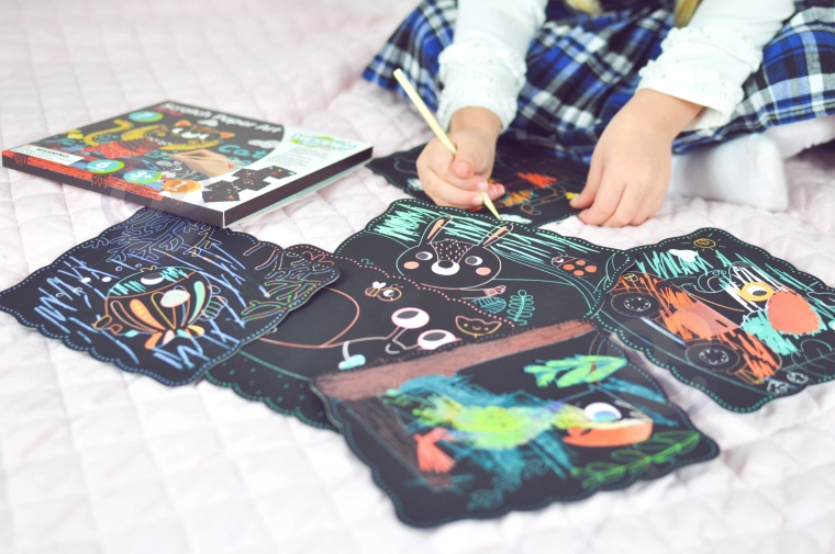 Le set créatif d’images à gratter WOOPIE ART&FUN offre aux enfants une manière simple et ludique de créer de superbes illustrations colorées. Il suffit de prendre le stylet en bois et, en grattant délicatement, de révéler les couleurs arc-en-ciel sous la couche noire. Les enfants apprécient la surprise des teintes et motifs qui apparaissent progressivement.