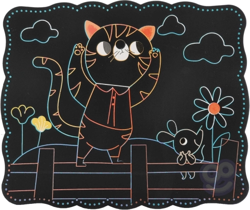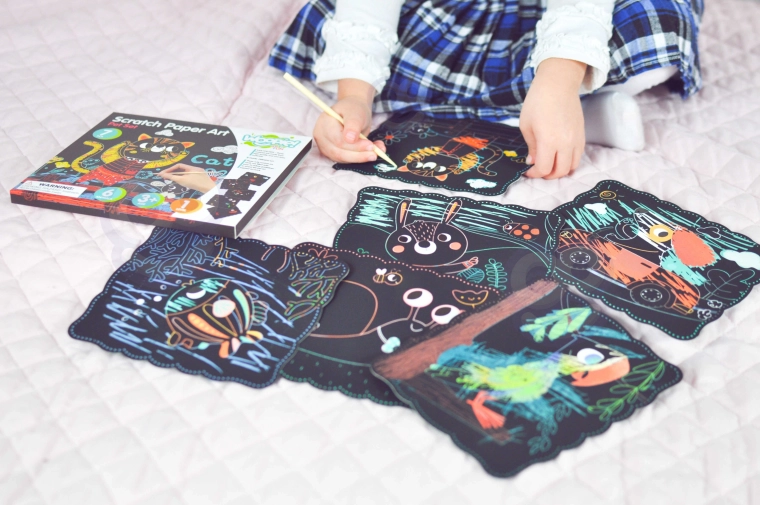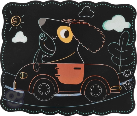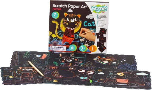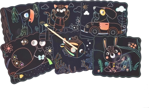 La boîte contient 6 cartes à gratter avec des animaux – chat, chien, escargot, lapin, poisson et perroquet – ainsi qu’un stylet en bois. Grâce à l’étui pratique avec fermeture, le set s’emporte facilement en voiture, au restaurant ou en vacances. Cette activité favorise la motricité fine, la patience et la créativité.