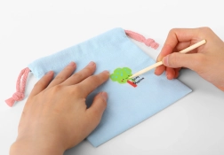 tissu (sac), bois (applicateur), papier/plastique (autocollants)