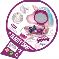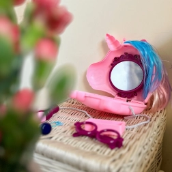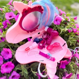 Ce set magique combine un sac et une coiffeuse en un seul produit. À l’ouverture, on découvre un miroir et des accessoires soigneusement organisés pour jouer au salon de coiffure et au maquillage. Les enfants peuvent coiffer la crinière colorée de la licorne, se parer de bagues ou de lunettes et « sécher » les cheveux — le tout en toute sécurité comme jeu d’imitation.